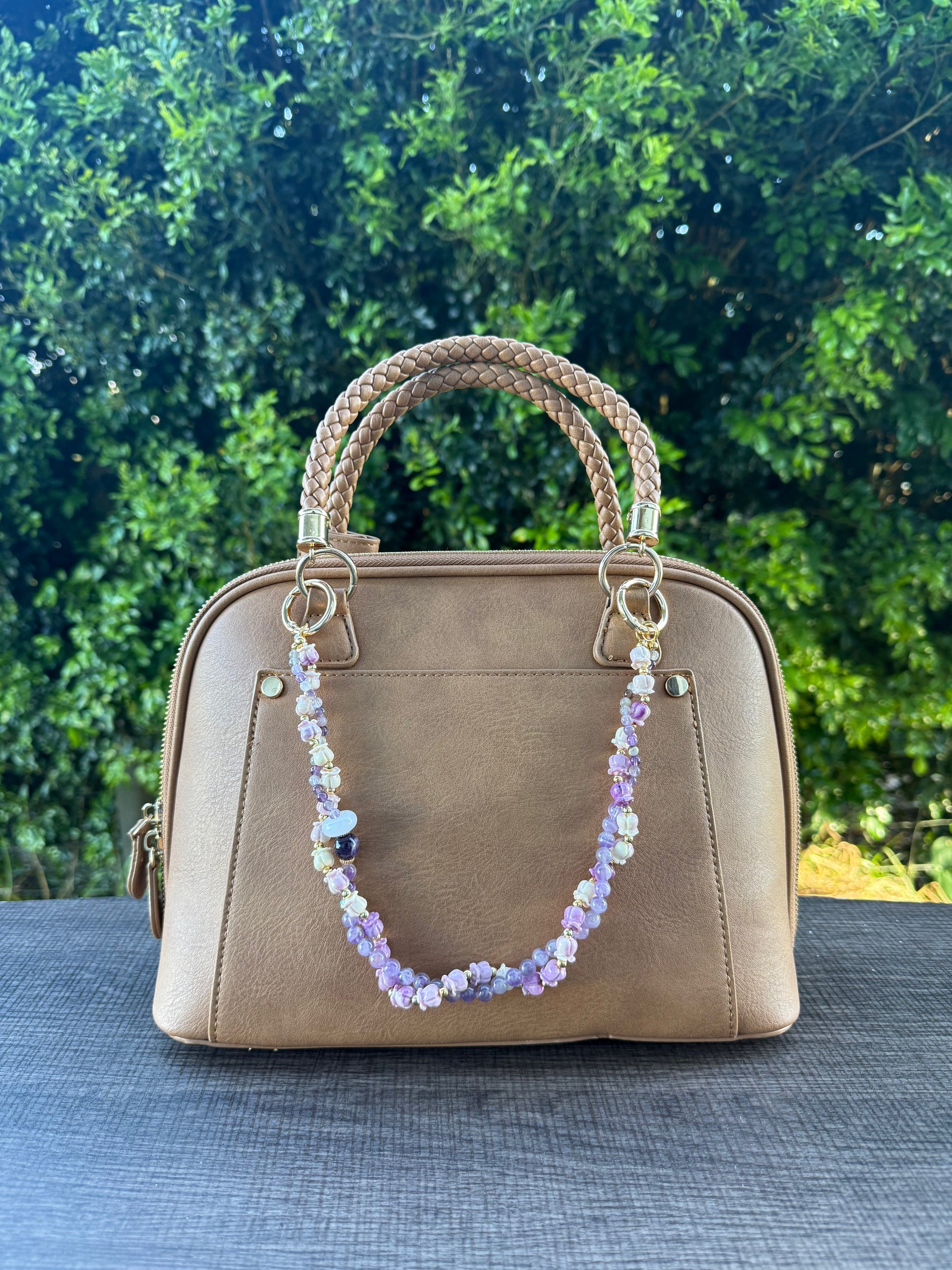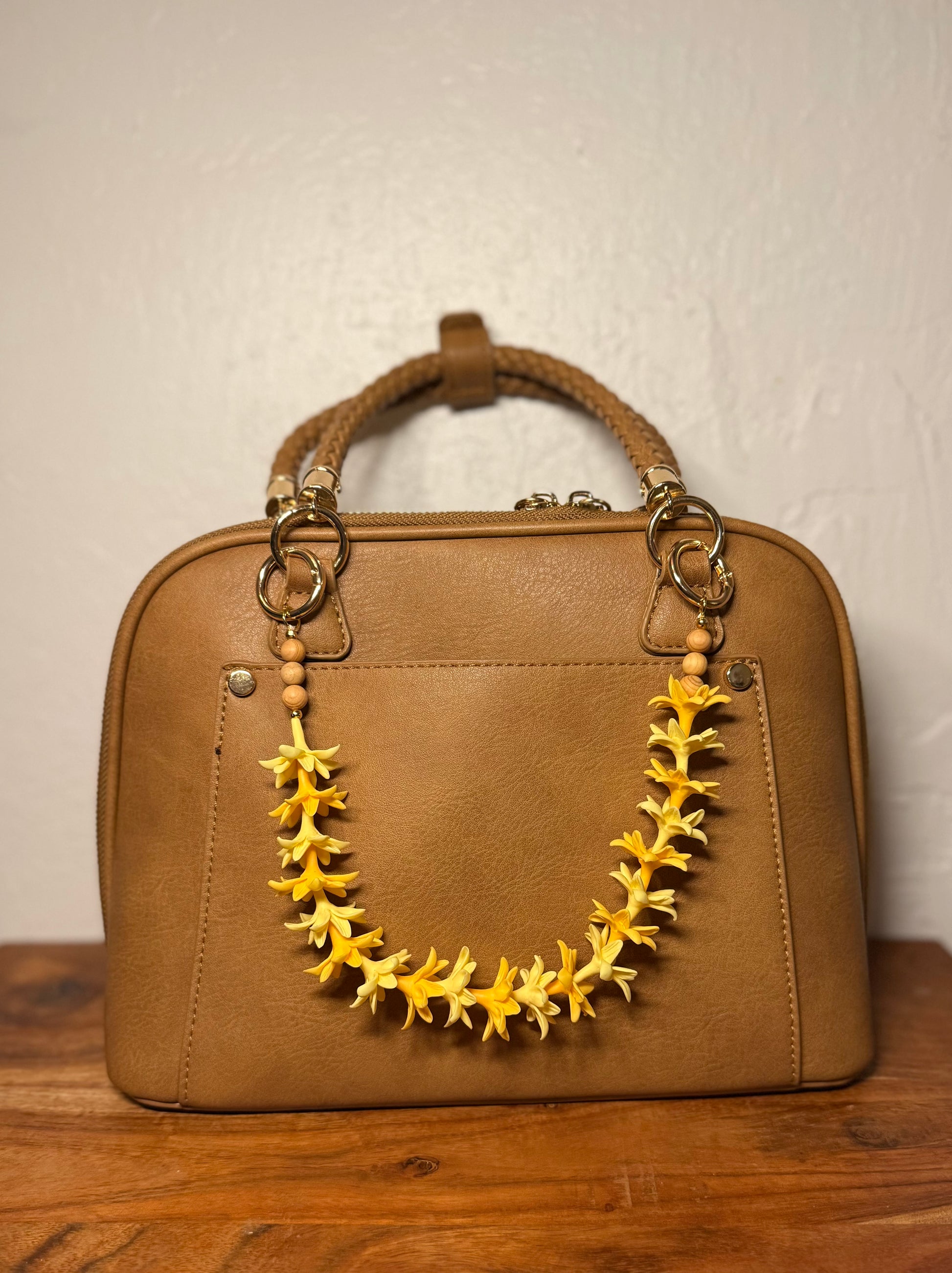 Handcrafted bag lei made with clay/resin flowers and beads. Lightweight and designed to hang on tote bags, handbags, backpacks. Inspired by the beauty of Hawaiian lei.